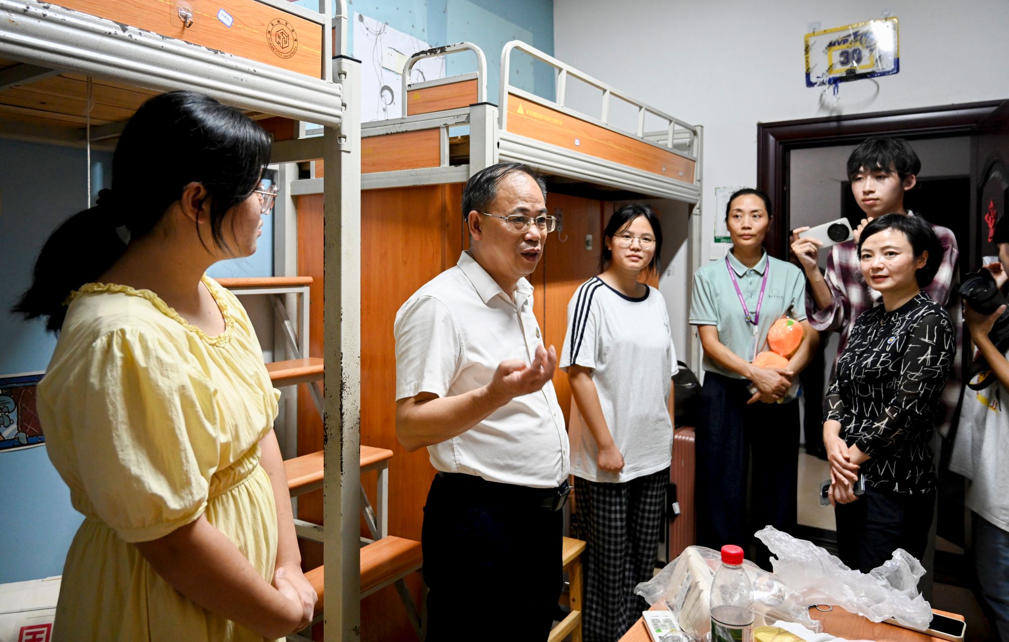 在学生寝室,何振与新生家长进行了交流。他说,请家长们放心,学校将积极创造更好的学习生活环境,全方位助力学生成长成才。“学校领导和老师这么认真负责,学校的服务细心又细致,让我们既放心又安心!”一位来自黑龙江的家长表示。