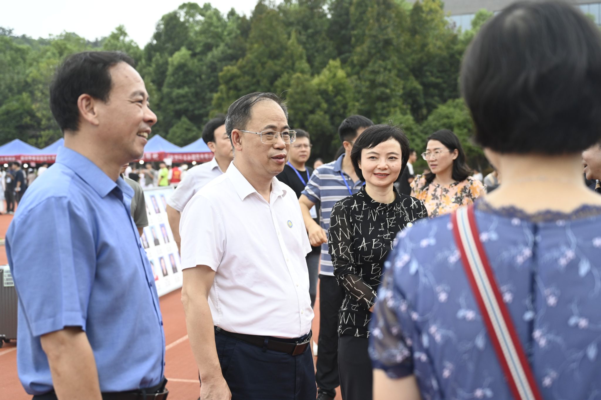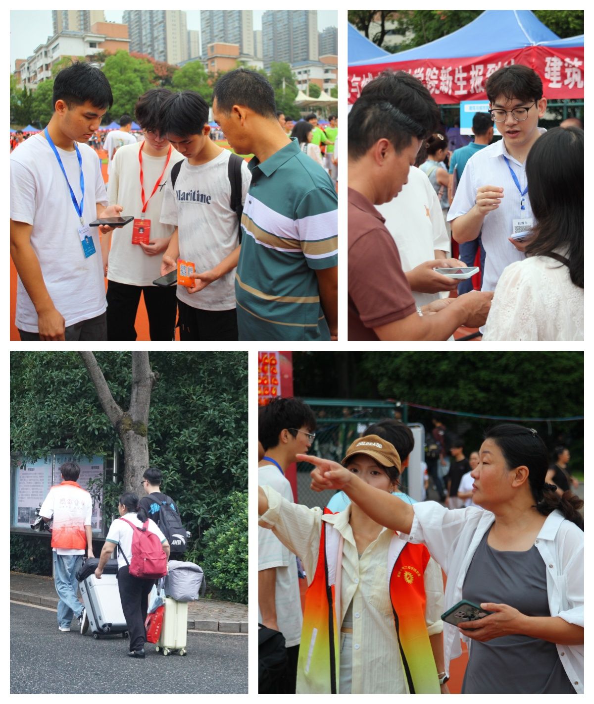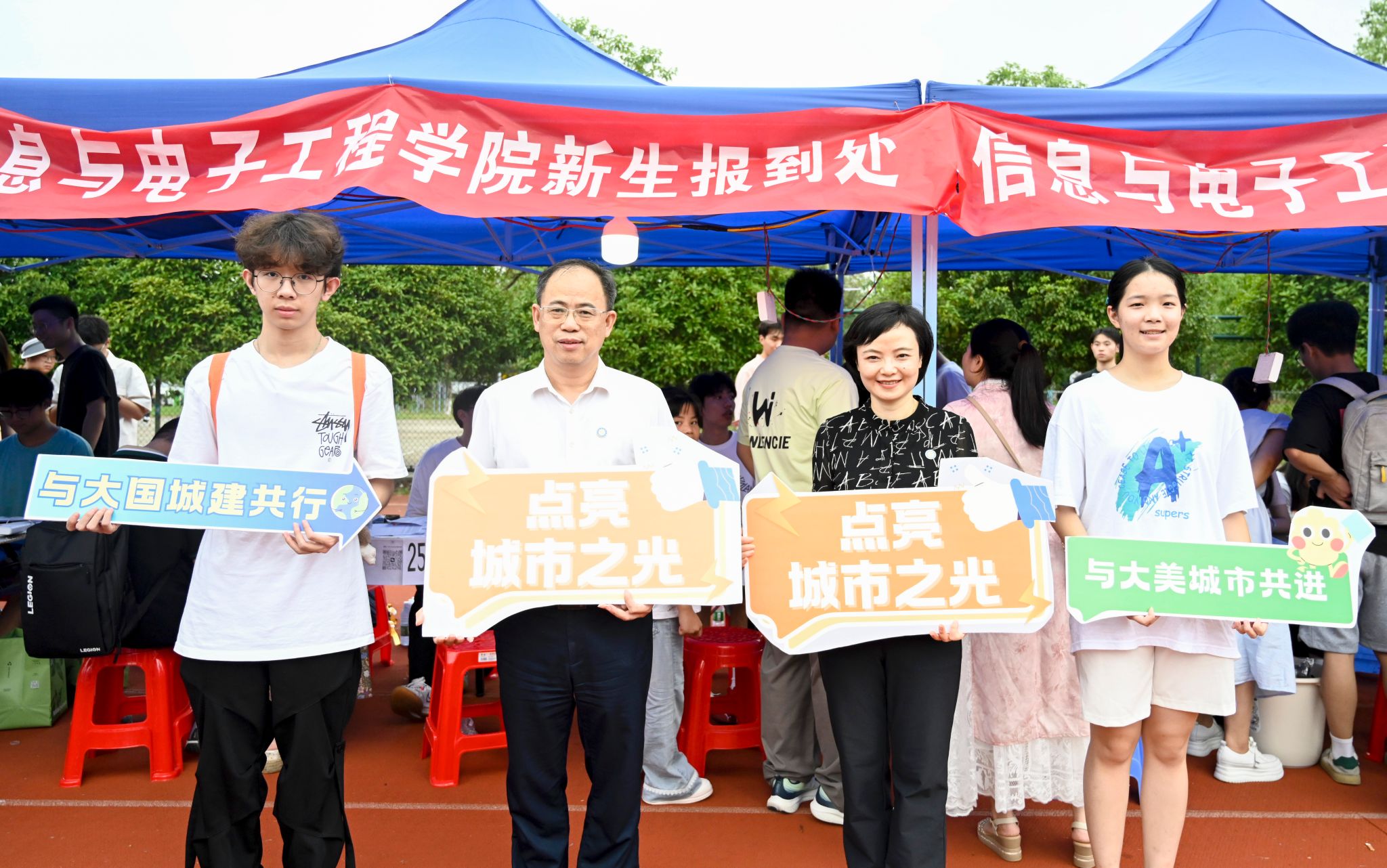 迎新第一天上午,校党委书记何振来到迎新现场,看望2025级新生,检查指导迎新工作。校领导陈瑜、袁志成、孙倩一同参加。