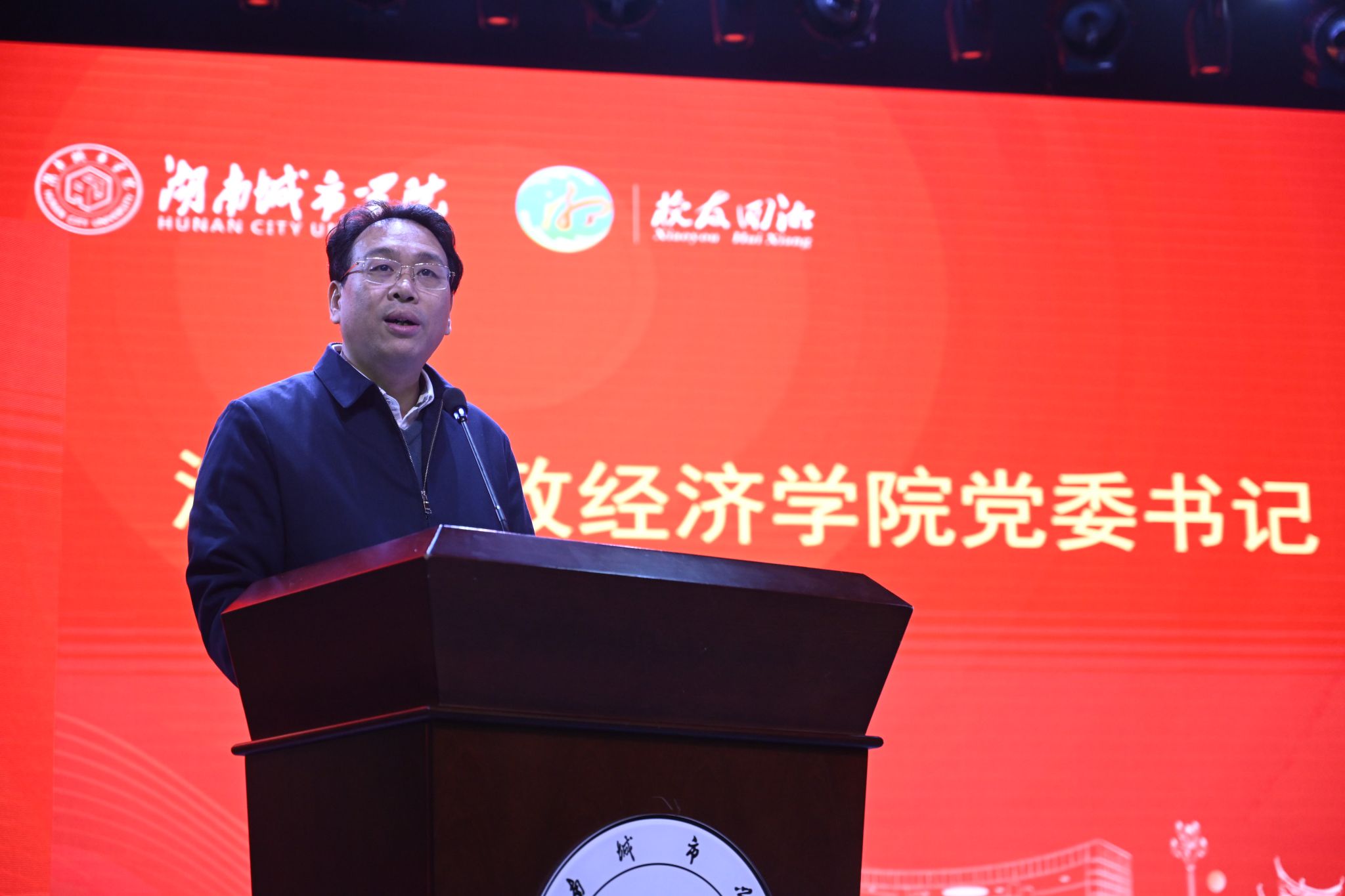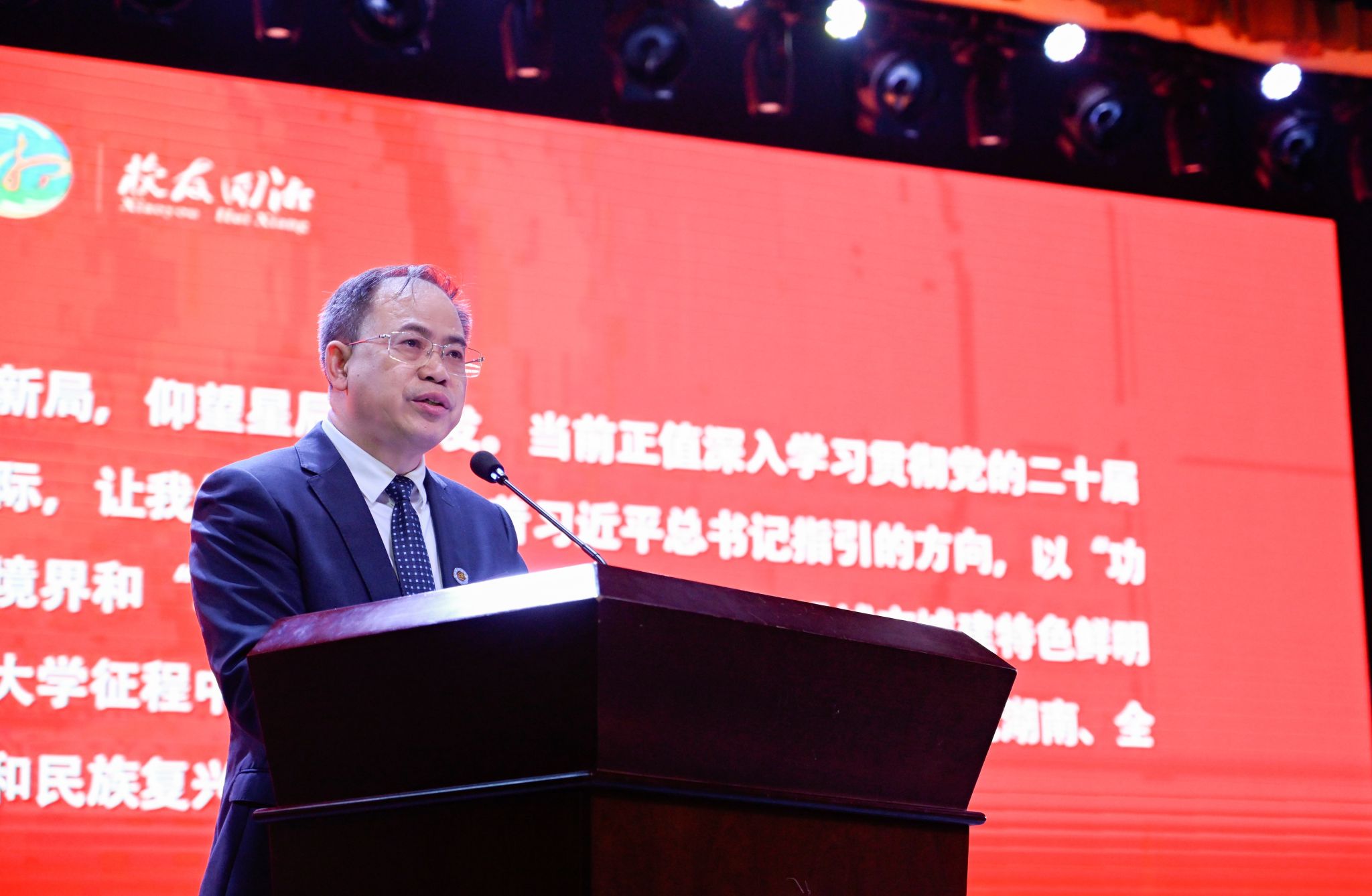 “站在建校55周年的历史时点,我们无比感激这个伟大的时代!”何振作了题为“同忆峥嵘岁月 共筑美好永利 奋进城市城建特色鲜明的高水平应用型大学新征程”的致辞。他从六个方面介绍了学校办学五十五周年以来的事业发展情况:一是自力更生、迎难而上,书写了舍身创业、勠力兴业的感人诗篇。白手起家,引领益阳高等教育先河。强强合并,完成专科向本科升级转型。稳中快进,实现本科向研究生教育跨越发展。二是勇开先河、执着坚守,擦亮了特色立校、城建报国的鲜明底色。聚焦城市主题,做强城建类特色学科。心怀“国之大者”,坚守城市城建主战场。深耕中小城镇,助力乡村全面振兴。三是扎根湖湘、走向世界,践行了为党育人、为国育才的初心使命。培根铸魂,造就城市精英。厚植沃土,培育创新栋梁。坚定自信,培养国际人才。四是应势而动、顺势而为,扬起了紧跟时代、勇立潮头的改革风帆。激励担当作为,深化干部体制改革。激发内生动力,深化人事综合改革。激活管理效能,深化精细化改革。五是瞄准前沿、精准服务,诠释了科技兴邦、服务建功的铁肩担当。争做尖兵,紧盯战略需求。协同攻关,筑牢科研平台。抢占高地,加速成果转化。六是矢志一流、趁势而上,吹响了升格大学、申报博士点的进军号角。坚定不移培养现代城市建设拔尖创新人才,坚定不移服务国家重大需求和经济主战场,坚定不移锚定“升大申博”主任务。
