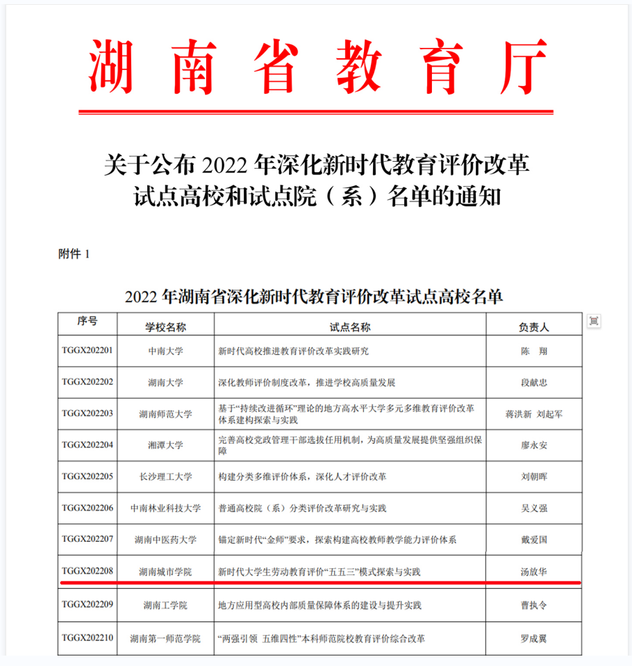 本网讯(通讯员 王立刚)近日,湖南省教育厅发布《关于公布2022年深化新时代教育评价改革试点高校和试点院(系)名单的通知》,永利申报的“新时代大学生劳动教育评价‘五五三’模式探索与实践”成功获批改革试点高校。本次共立项15所高校,其中本科高校10所,高职院校5所。