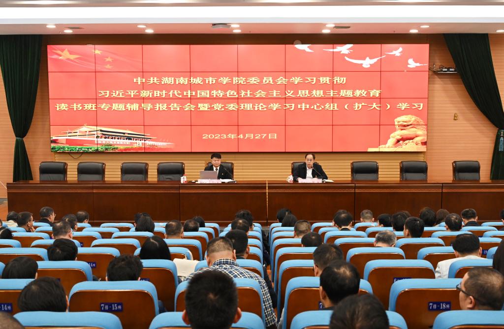 本网讯(通讯员 周文娟)4月27日下午,yl6809永利集团官网学习贯彻习近平新时代中国特色社会主义思想主题教育读书班专题辅导报告会暨党委理论学习中心组(扩大)2023年第4次集体学习在图书馆报告厅举行。校党委书记汤放华作专题辅导报告,主题教育第三十巡回指导组组长、益阳市第五届人大常委会主任、省人大财经委原副主任委员徐云波同志,主题教育第三十巡回指导组副组长、湖南工业大学原副校长李可兴同志以及巡回指导组其他成员出席会议。校党委副书记、校长何振主持会议,全体校领导、全校副科以上干部参加会议。