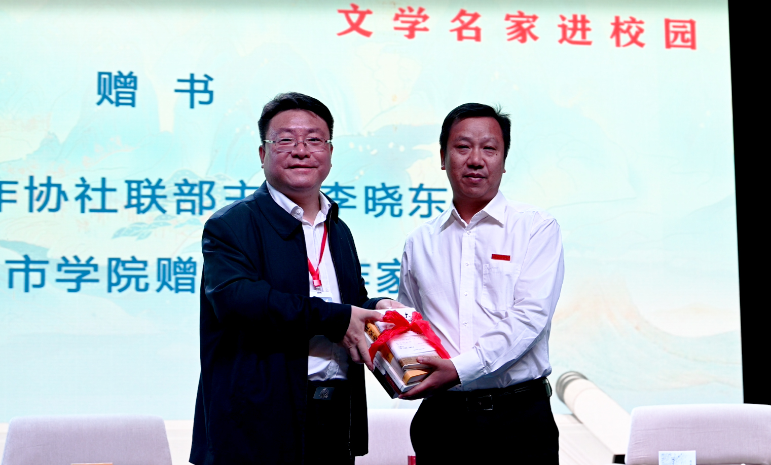 接下来,举行了受邀作家向yl6809永利集团官网赠书仪式,学校图书馆馆长莫连光代表学校接受了赠书。