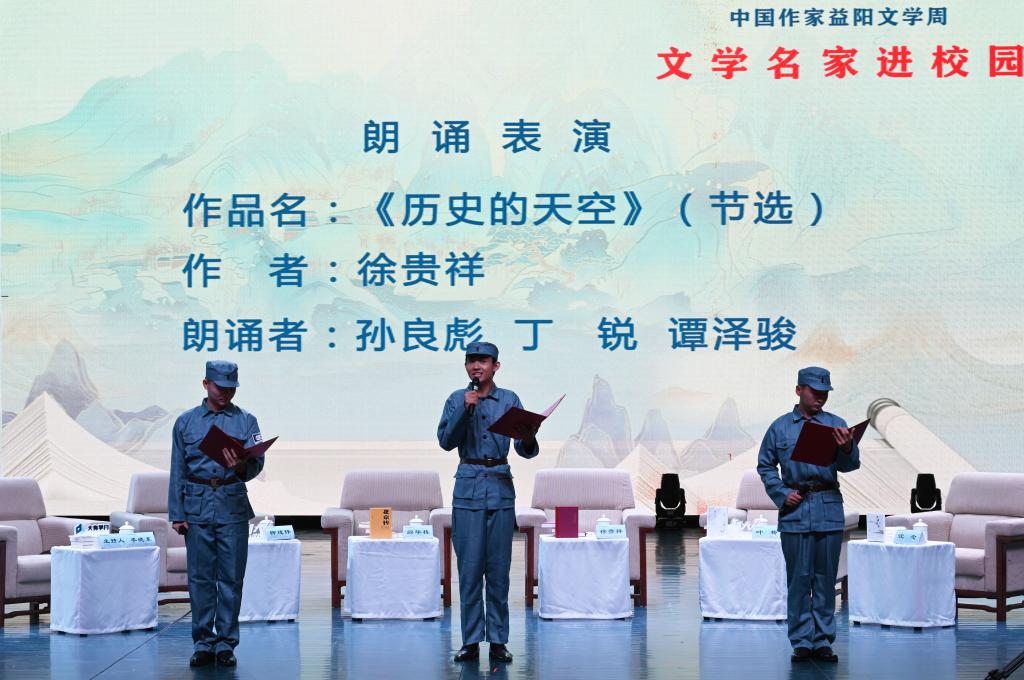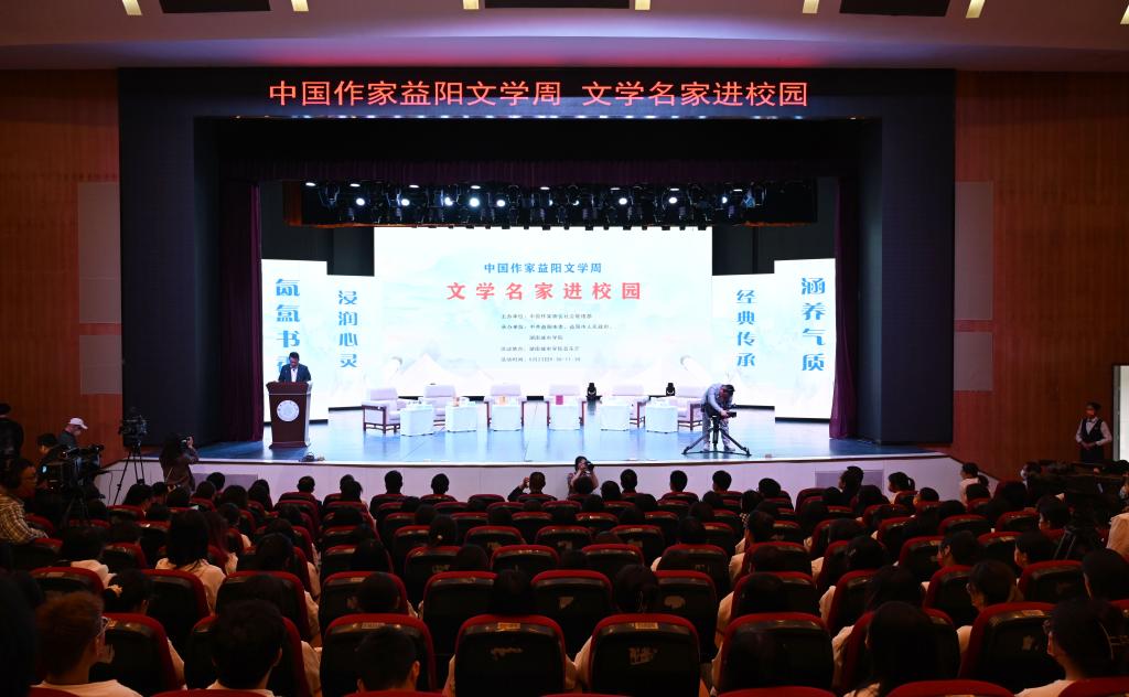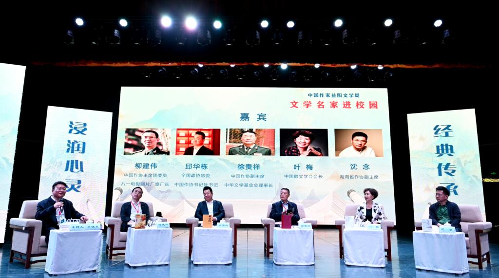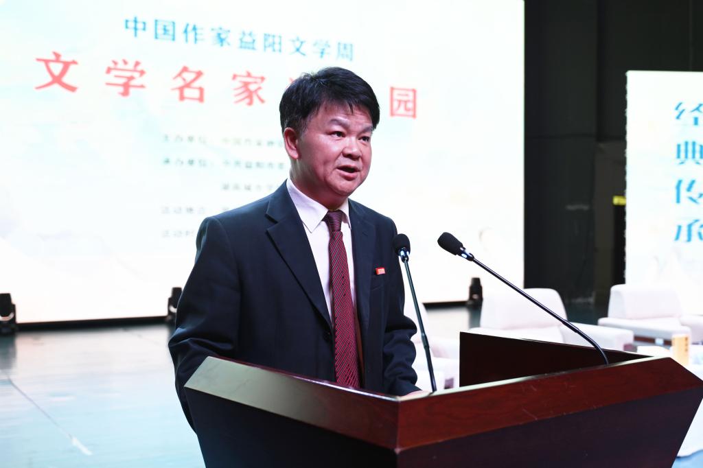 汤放华代表学校全体师生对与会作家和嘉宾的到来表示热烈欢迎。他表示,有着2000多年历史的益阳,人文积淀深厚、文化价值多元、文化名人辈出,书香洒满了山乡大地。yl6809永利集团官网作为益阳市最高学府,注重以文化人,以文赋能乡村振兴,成立了一批红色文化研究基地,立项了一批关于红色文化的国家级、省级重大科研教改项目,推动师生把红色文化资源利用好、把红色传统发扬好、把红色基因传承好。今天我们有幸迎来了一批文学名家走进校园,与他们面对面交流,共襄一场文化的盛宴,共赴一程精神的旅行。这是益阳人民的一件盛事,更是我们学校的一件盛事。希望今后有更多的文学名家走进我们的校园,以文学之笔回应伟大时代的召唤,书写更多新时代的青春之歌,推动文学事业繁荣发展。