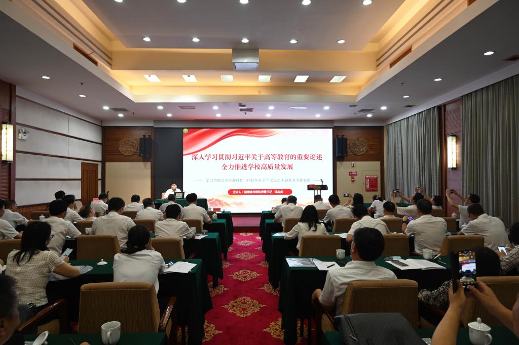下午,全体成员在韶山宾馆会议室进行了“以学增智”专题学习研讨。汤放华以《深入学习贯彻习近平关于高等教育的重要论述 全力推进学校高质量发展》为题,为大家上了一堂深刻的党课。汤放华紧密结合当前高等教育新形势和学校发展新情况,通过详实的数据对比、丰富的案例讲解,从领会精神、再学习再思考习近平总书记关于教育重要论述,审时度势、切实增强教育强国的责任感使命感和紧迫感,狠抓落实、谱写新时代新征程yl6809永利集团官网高质量发展新篇章三个方面,阐述了学习贯彻习近平总书记关于教育的重要论述我们要做什么、怎么做的问题。