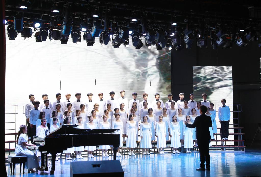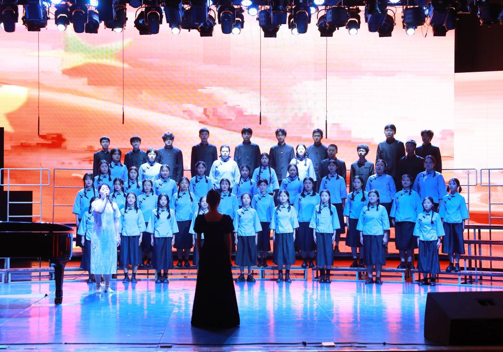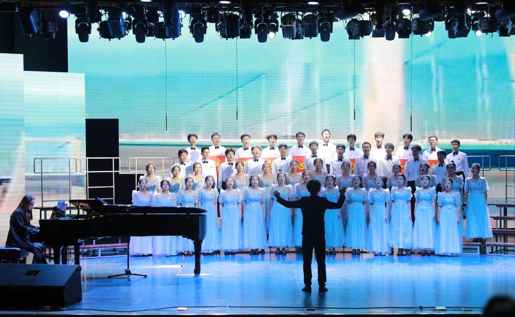 一袭红白渐变的长裙,一身笔直的西装,美术与设计学院/国际教育学院40名大学生饱含深情演唱了《我爱你中国》,拉开了比赛的帷幕。伴随着激情澎湃的节奏,《灯火里的中国》《中国军魂》《国家》《祖国不会忘记》在同学们的倾情演绎中,表达了对祖国的深情祝福;《梨花又开放》《唱支山歌给党听》《映山红》重温了党的百年光辉历程,抒发了青年对中国共产党的热爱和对美好生活的无限向往;音乐与舞蹈学院合唱团表演的《忆秦娥·娄山关》,再现红军攻克娄山关的胜利场景,合唱团成员们有力的歌声、坚定的神情,带给现场观众最震撼人心的力量。校歌《精英,从这里扬帆启程》的青春旋律久久回荡,令人动情。