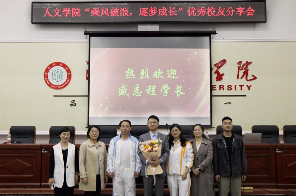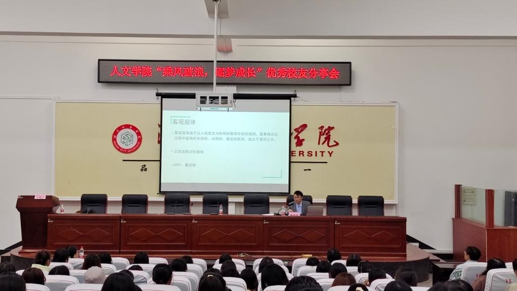 盛志程以“乘风破浪,逐梦成长”为题讲述了自己的求学成长经历,从“想到和做到”“自律和规律”“小家和大家”三个维度着手,分享自己的所思所悟所想。盛志程表示,人文学院一直以来高度重视立德树人工作,在党建、团建活动中厚植家国情怀,在教学活动中致力于开拓学生的国际视野,这都坚定了自己以身许国的理想信念,夯实了他勇敢逐梦的信心底气。他希望同学们倍加珍惜和利用学校学院提供的平台和资源,创造更大的辉煌。盛志程寄语与会同学:一要志存高远、胸怀天下,将个人前途与国家命运紧密相连;二要发现规律、利用规律,用科学的方法指导学习和工作;三要步步为营、稳扎稳打,积小胜为大胜,化量变为质变。