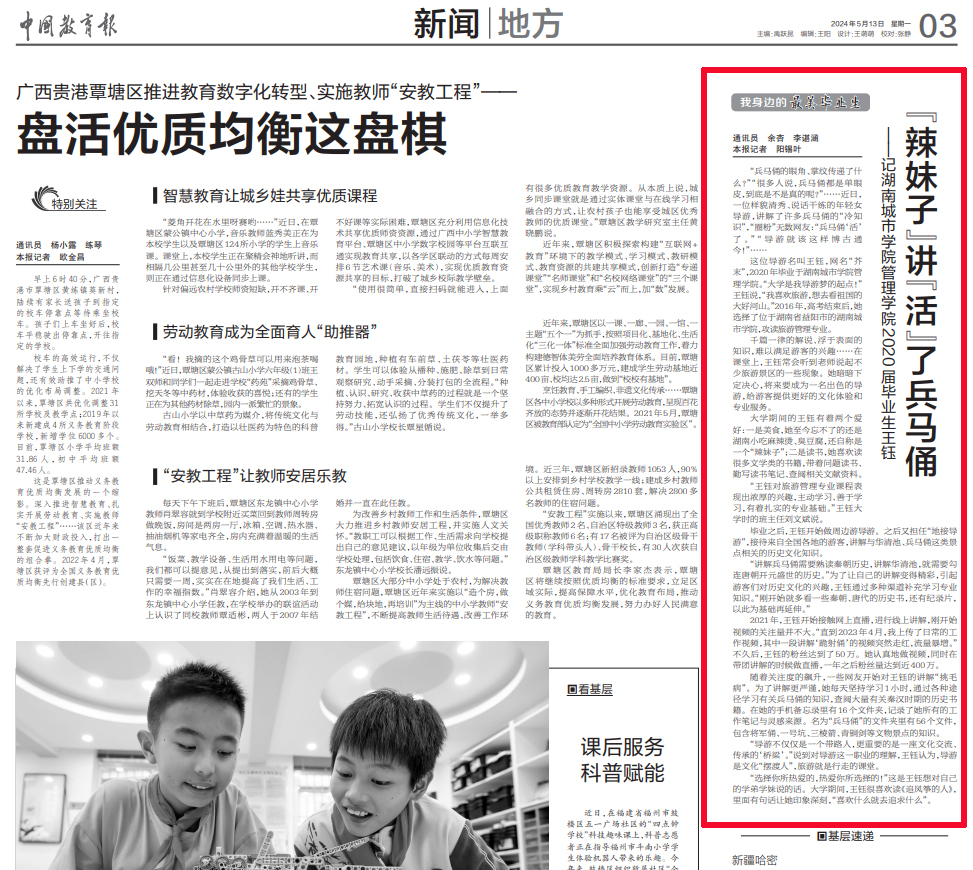 本网讯 5月13日,《中国教育报》第3版报道yl6809永利集团官网管理学院2020届优秀校友王钰讲“活”兵马俑、火爆全网的青春励志故事。全文如下:
