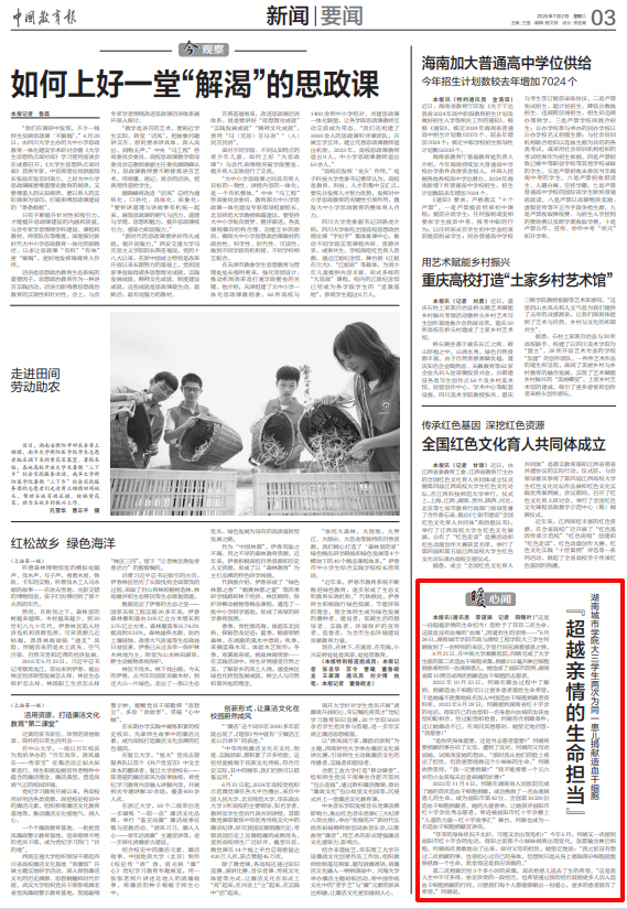 7月2日,《中国教育报》03版要闻版报道永利学生何晴两次为同一患儿捐献造血干细胞的事迹。