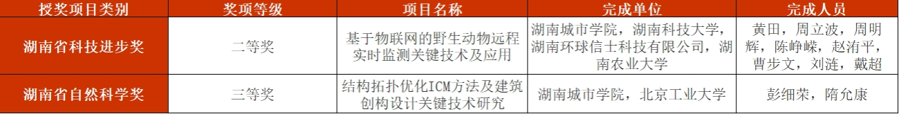 其中,永利信息与电子工程学院黄田副教授主持完成的“基于物联网的野生动物远程实时监测关键技术及应用”项目获湖南省科技进步奖二等奖,土木工程学院彭细荣教授主持完成的“结构拓扑优化ICM方法及建筑创构设计关键技术研究”项目获湖南省自然科学奖三等奖。