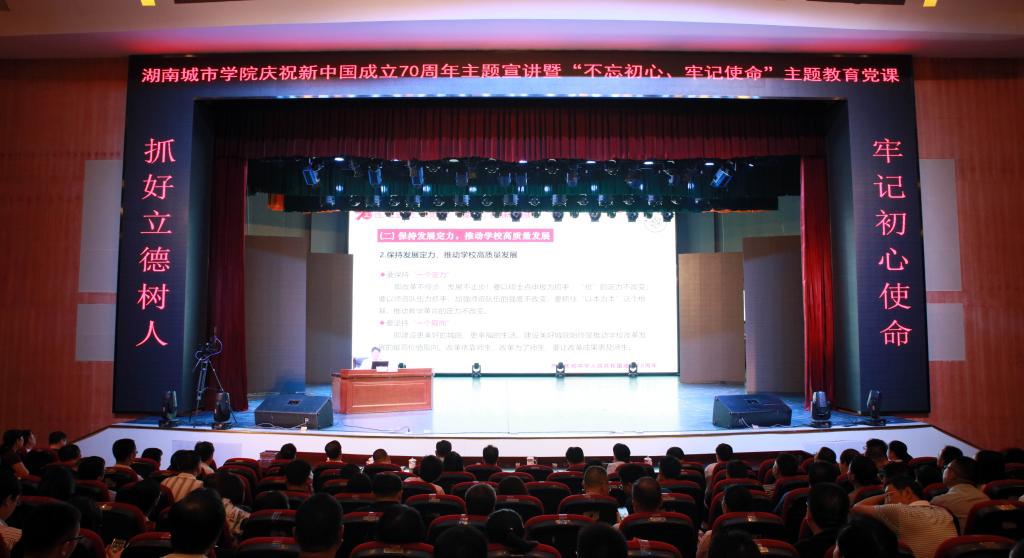 (本网讯)为热烈庆祝中华人民共和国成立70周年,激发爱国情,强化爱国志,根据省委教育工委《关于认真组织好庆祝中华人民共和国成立70周年主题宣讲活动的通知》精神,结合永利“不忘初心、牢记使命”主题教育活动开展,2019年9月27日下午,学校举行庆祝新中国成立70周年主题宣讲暨“不忘初心、牢记使命”主题教育党课。党委书记罗成翼作题为《牢记初心使命,抓好立德树人,以实际行动庆祝中华人民共和国成立70周年》的主题宣讲报告,党委副书记、校长李建奇主持报告会。
