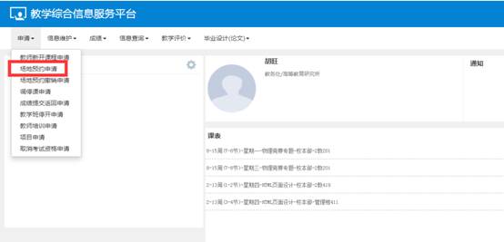 1、用教师身份登录“永利门户”,点击页面左侧“新教务”系统。点击申请→场地预约申请。