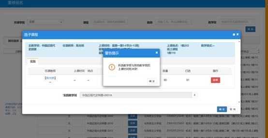 进入重修报名页面,如“跟班重修(选课)”界面中有教学班显示,请先在“跟班重修(选课)”中选择相应的教学班,点击选课,根据提示操作。