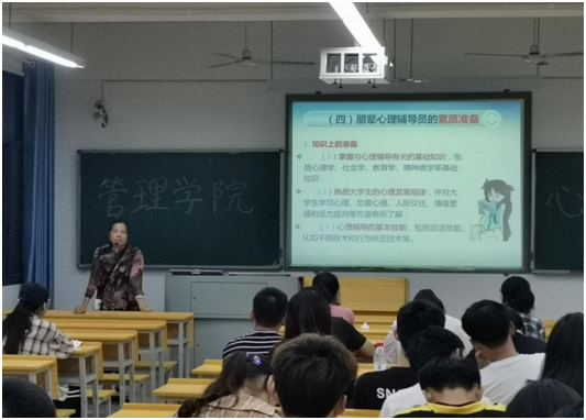 培训开始之前,各班心委同学按时到达会场。在本次培训中,首先由张力老师向大家介绍培训工作的重要性和心委同学工作的具体改动事项;接着便由曹资立老师主讲本次培训的主要内容。