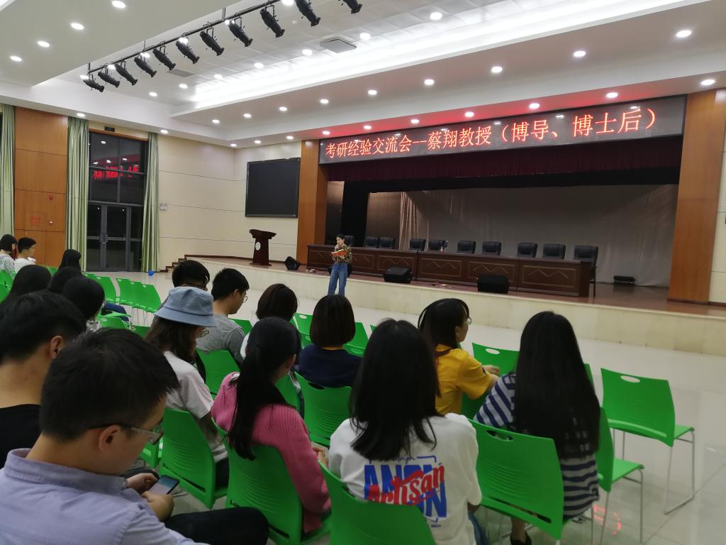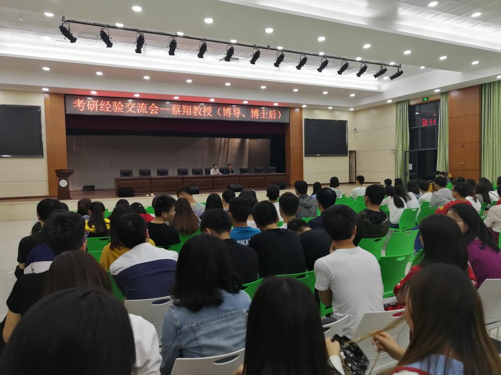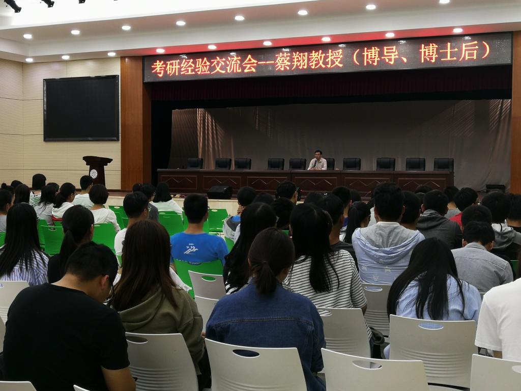 2018年4月18日晚7:00,管理学院就业与考研经验交流会于新食堂三楼学生活动中心举行,本次交流会由桂林电子科技大学博士生导师蔡翔教授进行主讲,yl6809永利集团官网管理学院党委副书记贺望林主持,出席本次交流会的有管理学院学工办主任王方俊、辅导员张力、14级考研录取学生代表以及15、16级有考研意向的学生。