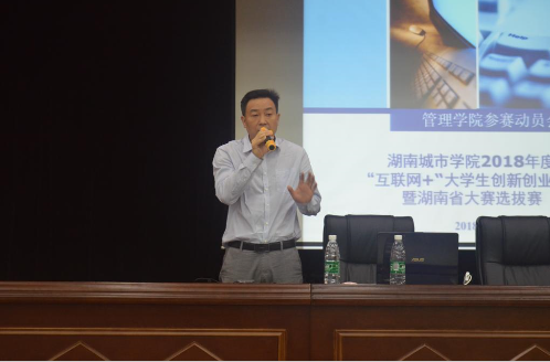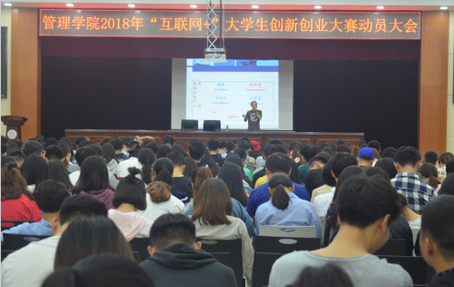 2018年4月1日、4月3日晚七点,管理学院针对全体在校学生召开了连续两场“互联网+”大学生创新创业大赛动员大会,地点在学生活动中心。主讲人是管理学院副院长汤勇及管理学院公共管理系主任李双清,出席本次动员大会的嘉宾有管理学院党委副书记贺望林、分团委书记李姗、辅导员黄慧雅。