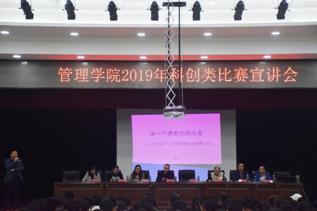 为了让大一新生更好的了解“创青春”等各项创新创业比赛,激发学生创新创业灵感,增加创新创业知识,提高大一新生的参赛积极性。2019年10月28日19:00,管理学院科创宣讲会在大学生活动中心隆重举行,本次出席宣讲会的嘉宾有管理学院党委副书记王润华教授,管理学院副院长李双清博士,应用与创新产业学院主任郭自嘉老师,管理学院刘刚老师、周琼老师、朱伟华老师、郭美兰老师、董成老师。