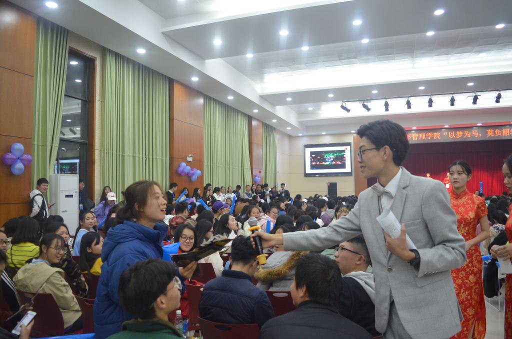 2018年12月1日19:00,管理学院2018年迎新晚会在新食堂三楼举行。出席本次活动的嘉宾有管理学院院长孙倩、党委书记汤腊梅、党委副书记贺望林、部分教师、2012级旅游管理专业12位毕业校友、大一全体学生按时到场与会。