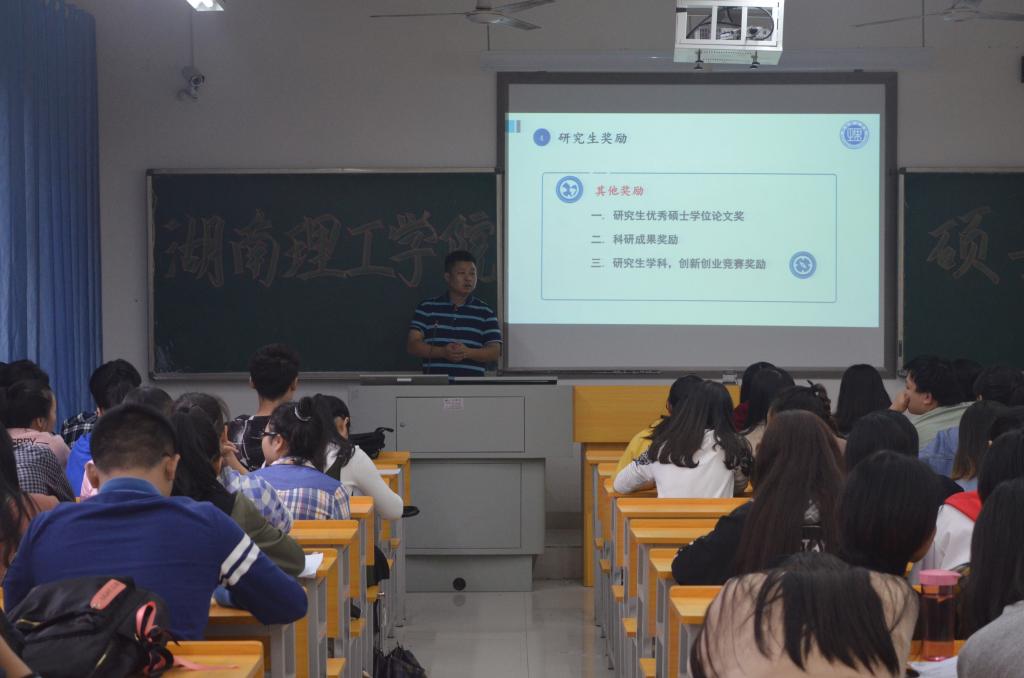 首先,管理学院分团委书记李姗对活动做简要介绍,并邀请湖南理工学院田小勇教授上台演讲。然后,田小勇教授简述了湖南理工学院的基本概况,他邀请同学们观看校园介绍视频,其主要记录了湖南理工学院的校园环境特点,也再现了部分学院学生认真学习的场景。视频的结尾提到学校对全体学生的殷切期望,并希望同学们认真领会“至善穷理,秉诚前进”的精神。紧接着,田教授重点介绍了学校经管学院的师资力量和学院的三个硕士点单位:应用经济学硕、会计学硕和旅游管理专硕,详细讲解三个硕士招生的主要研究方向和招生考试科目。最后,田教授提到该院充足的经费支持和研究生奖励,号召大家不忘初心,砥砺前行,坚持梦想,同时结合自身实际,把握机会,为国家做出贡献。至此,湖南理工学院的硕士点招生活动圆满结束。