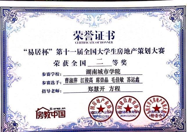 2019年11月22-24日,由中国房地产业协会指导、中国建设教育协会主办,北京建筑大学、房教中国、深圳大学联合承办的“易居杯”第十一届全国大学生房地产策划大赛全国总决赛在深圳大学隆重举行,永利派出两支队伍参加,均获全国二等奖佳绩,并获大赛“优秀组织高校”荣誉。
