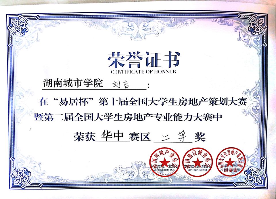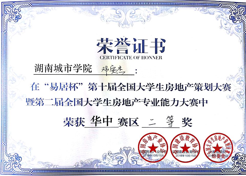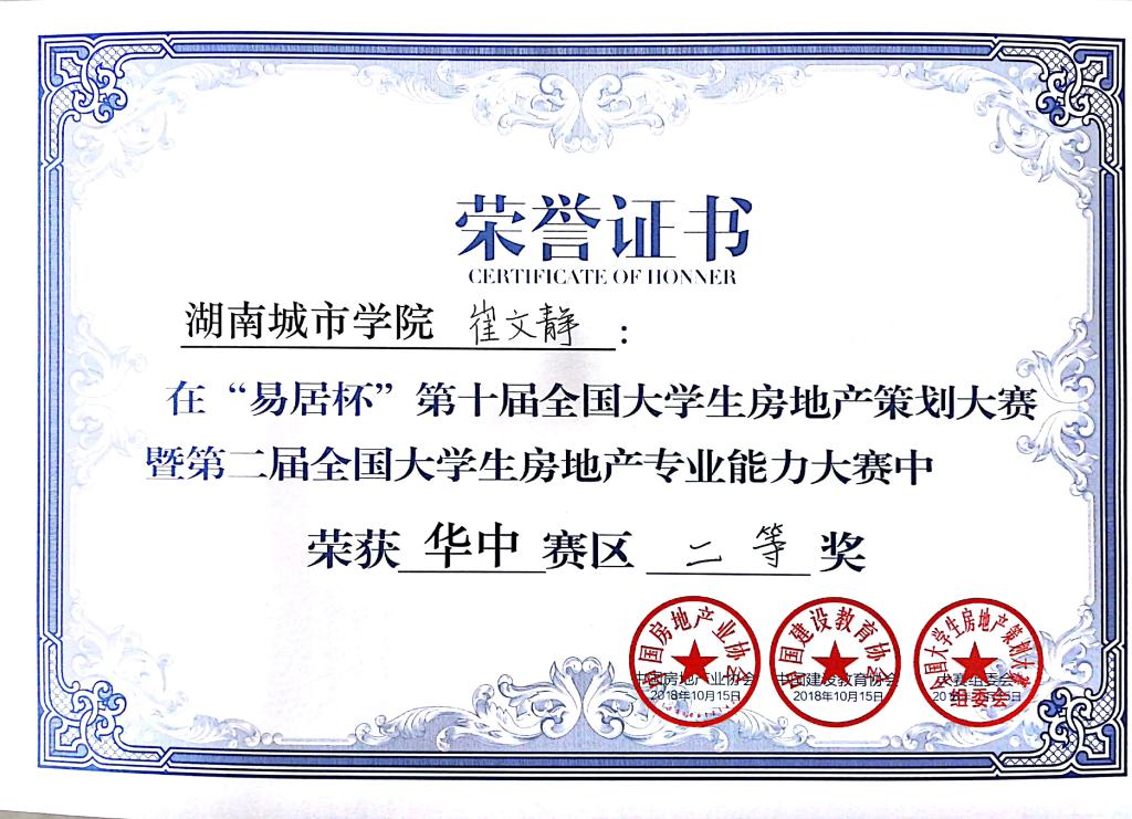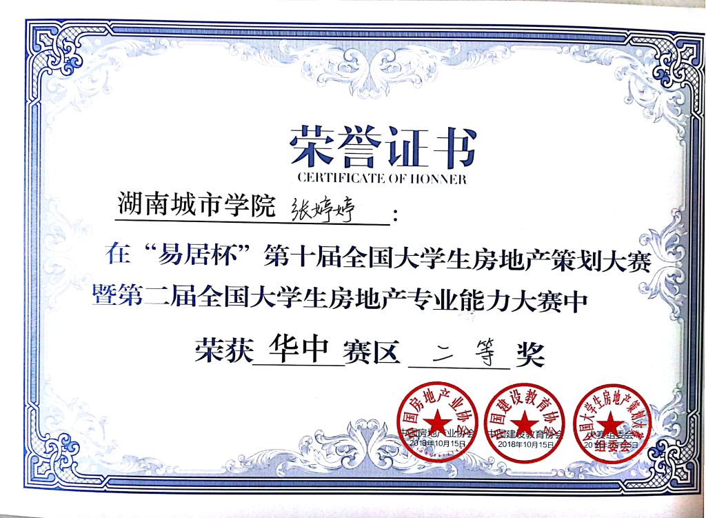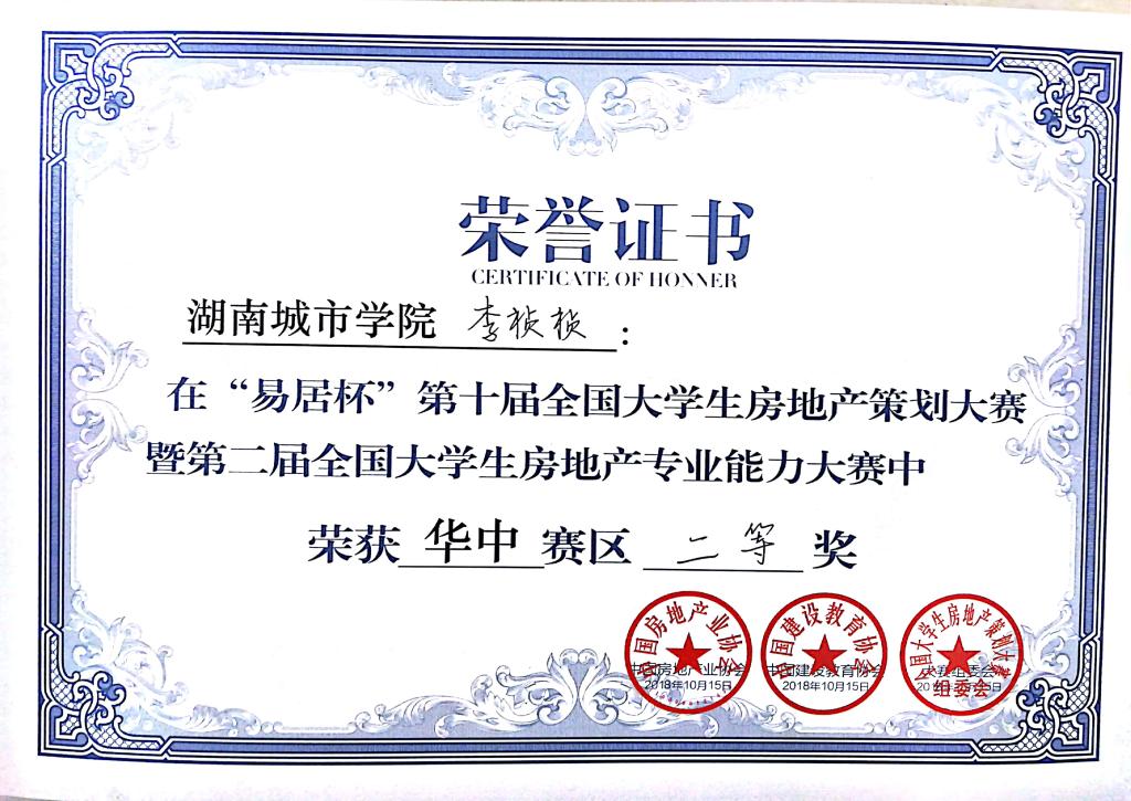2018年10月15日至16日,“易居杯”第十届全国大学生房地产策划大赛华中赛区在武汉举行,本次大赛有170所高校参与,6500名学生报名,全国分七大赛区进行。管理学院郑慧开老师指导的“筑家”团队参加了华中赛区复赛,获得了二等奖,参赛队员为房地产开发与管理专业张婷婷、崔文静(15级)、李祯祯(16级),城市规划专业刘吉(15级)、环境设计专业邓安杰(16级)五位同学。