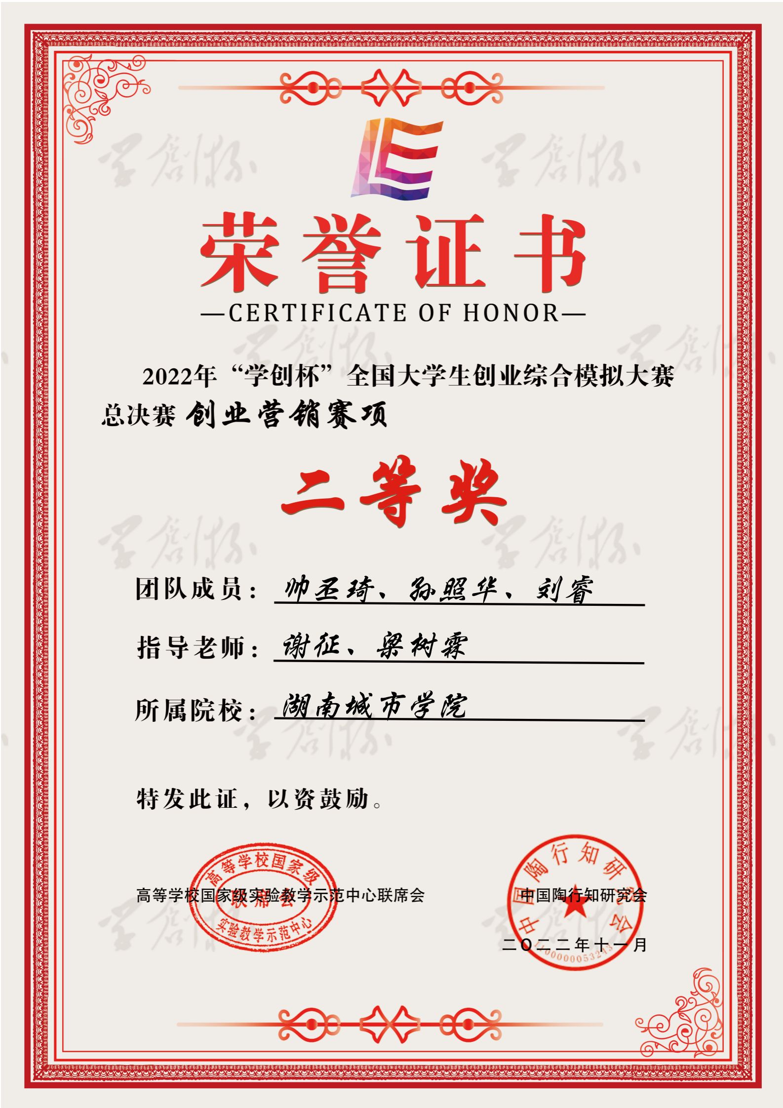 伴随着时间匆匆的脚步,承载着辛勤努力的喜悦,11月5日,永利管理学院工商管理专业三名优秀学子帅丕琦、刘睿、孙照华在“2022年全国学创杯模拟大赛”总决赛中斩获国家二等奖。此次获奖证书由国家教育部颁布,意义非凡。