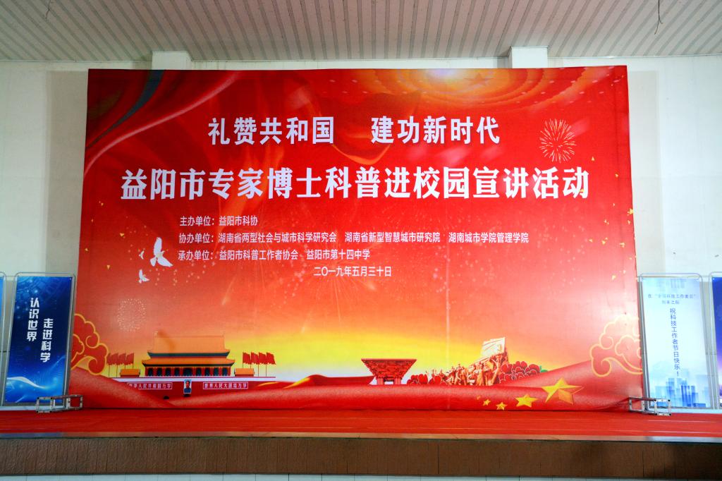 2019年5月30日,益阳市专家博士科普进校园活动在益阳市第十四中学举行。此次活动由益阳市科协主办、yl6809永利集团官网管理学院、湖南省两型社会与城市科学研究会、新型智慧城市研究院协办。管理学院院长孙倩、管理学院书记、省两型社会与城市科学研究会秘书长徐习军、信息与电子工程学院院长阳王东以及博士代表杜林远、刘洋、阳俊老师一行参加活动,益阳市人大常委会副主任刘时贵、益阳市科协党组副书记、副主席胡旗等市、区相关领导出席。