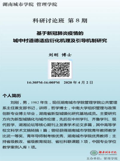 本次科研讨论班邀请了yl6809永利集团官网学科建设与发展规划处副处长汤勇教授主持,学院院长孙倩教授、科研副院长赵旭教授及管理学院教师共23人参加。本次科研讨论班由“城乡治理与工程管理”团队负责人任国平博士组织,“行政伦理与公共管理”团队负责人刘刚博士主讲。刘刚博士结合当下疫情和自身研究方向,选择《基于新冠肺炎疫情的城中村道德适应衍化机理及引导机制研究》为主题,探讨新冠肺炎疫情下城中村居民道德适应的范式转化、衍化机理,为新冠疫情下的城中村居民城市适应进行慎的伦理反思和道德辩护。讲座期间管理学院多位老师就刘刚博士的研究问题进行了积极的讨论,取得了很好的反响。(通讯员:任国平)