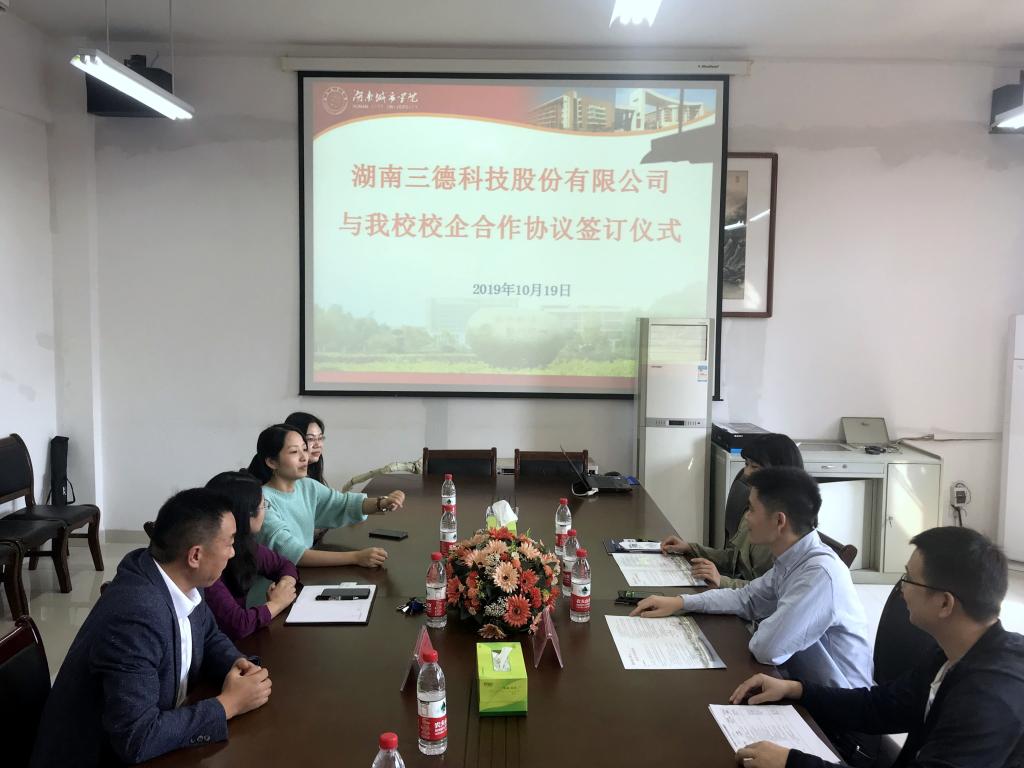 2019年10月19日下午,湖南三德科技股份有限公司与永利校企合作签约仪式活动成功举办。湖南三德科技股份有限公司技术服务部经理朱红兵、招聘主管王丽平以及yl6809永利集团官网管理学院院长孙倩、副院长李双清、工商管理专业相关老师出席本次活动。