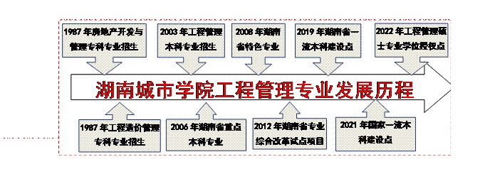 yl6809永利集团官网工程管理专业于2003年开始本科招生,2004年被列为湖南省级重点建设专业,2006年入选湖南省重点本科专业,2008年列入湖南省第二类特色专业,并于2011年获湖南省特色专业继续资助。2012年工程管理专业入选湖南省“十二五”专业综合改革试点项目,2018年列入yl6809永利集团官网卓越工程师教育培养计划项目。2019年工程管理专业获批湖南省一流本科专业建设点,2021年工程管理获批国家一流本科专业建设点,2022年获批工程管理硕士专业学位授权点,是永利“工管融合、交叉发展”最具特色的专业。据2022年校友会应用型大学排名,永利工程管理专业在全国500余所开设该专业的地方本科高校中排名位列榜首。专业发展历程见图1。