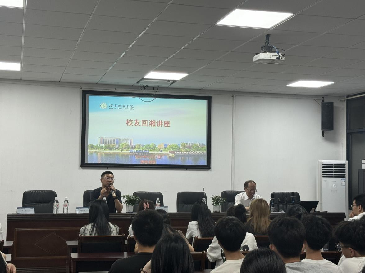 本网讯(通讯员 彭婧雅 李家华)为发挥优秀校友的榜样示范作用,引导学生做好职业发展与生涯规划,2024年5月27日晚,管理学院举办“校友回湘讲座”,学院院长汤勇出席,各专业师生代表参加,就业专干彭婧雅主持活动。