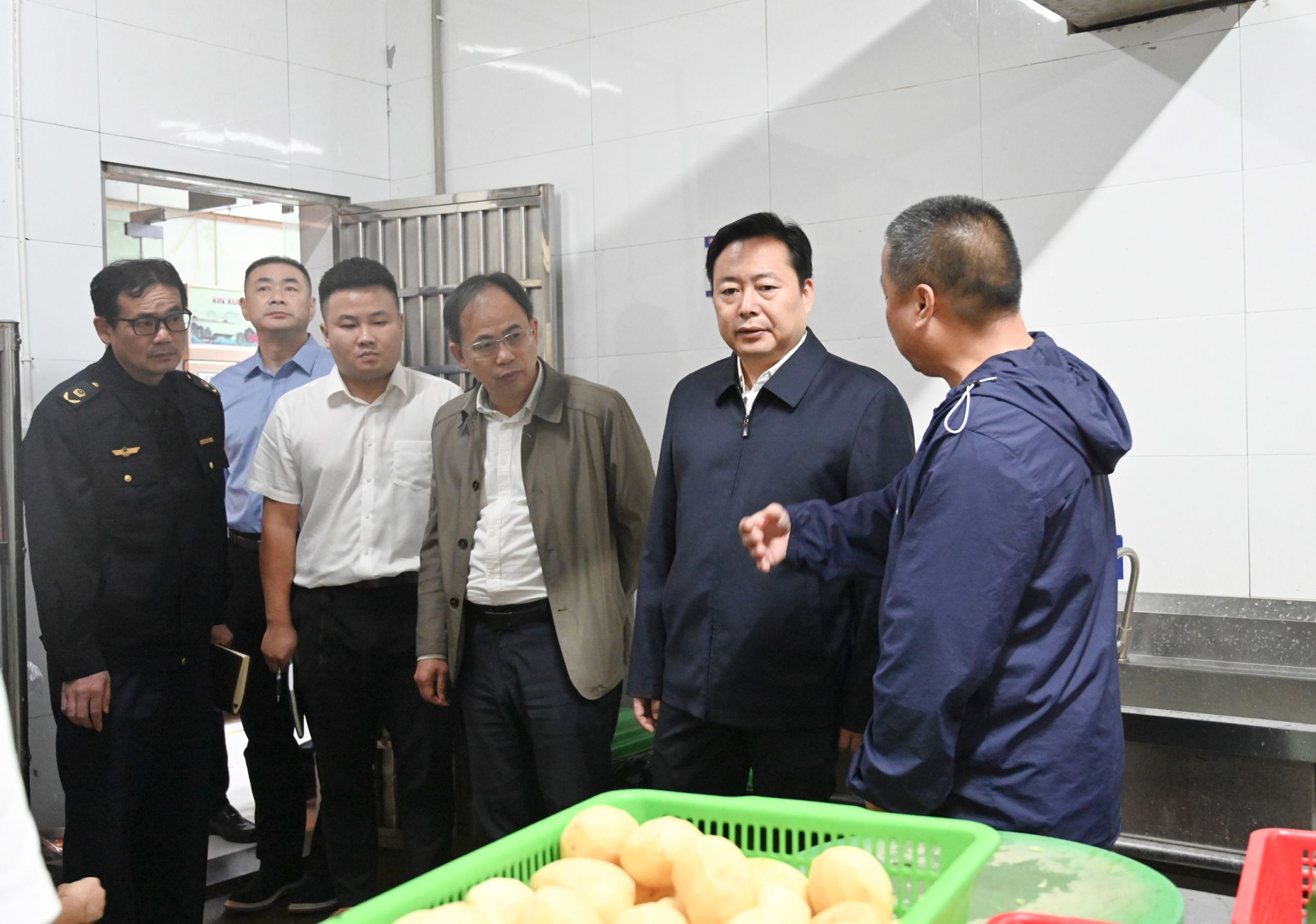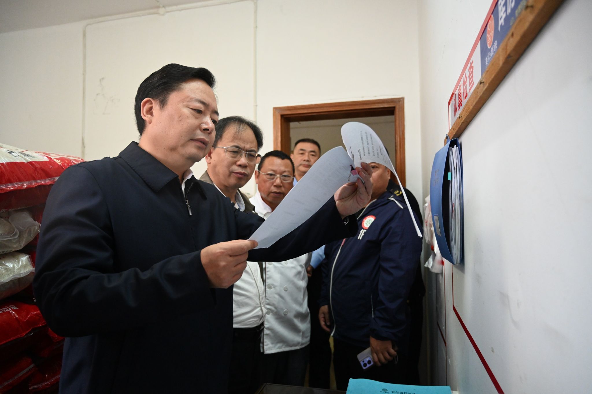 在学校四食堂,熊炜实地察看学生就餐环境、副食仓库、食品原料存储区,详细了解食堂原料采购、食品贮存、生产加工、食品留样、员工管理、学生就餐等各环节流程,仔细查阅相关资料和台账,听取学校负责人关于食品安全管理制度建设、进货查验、生产流程等情况汇报。