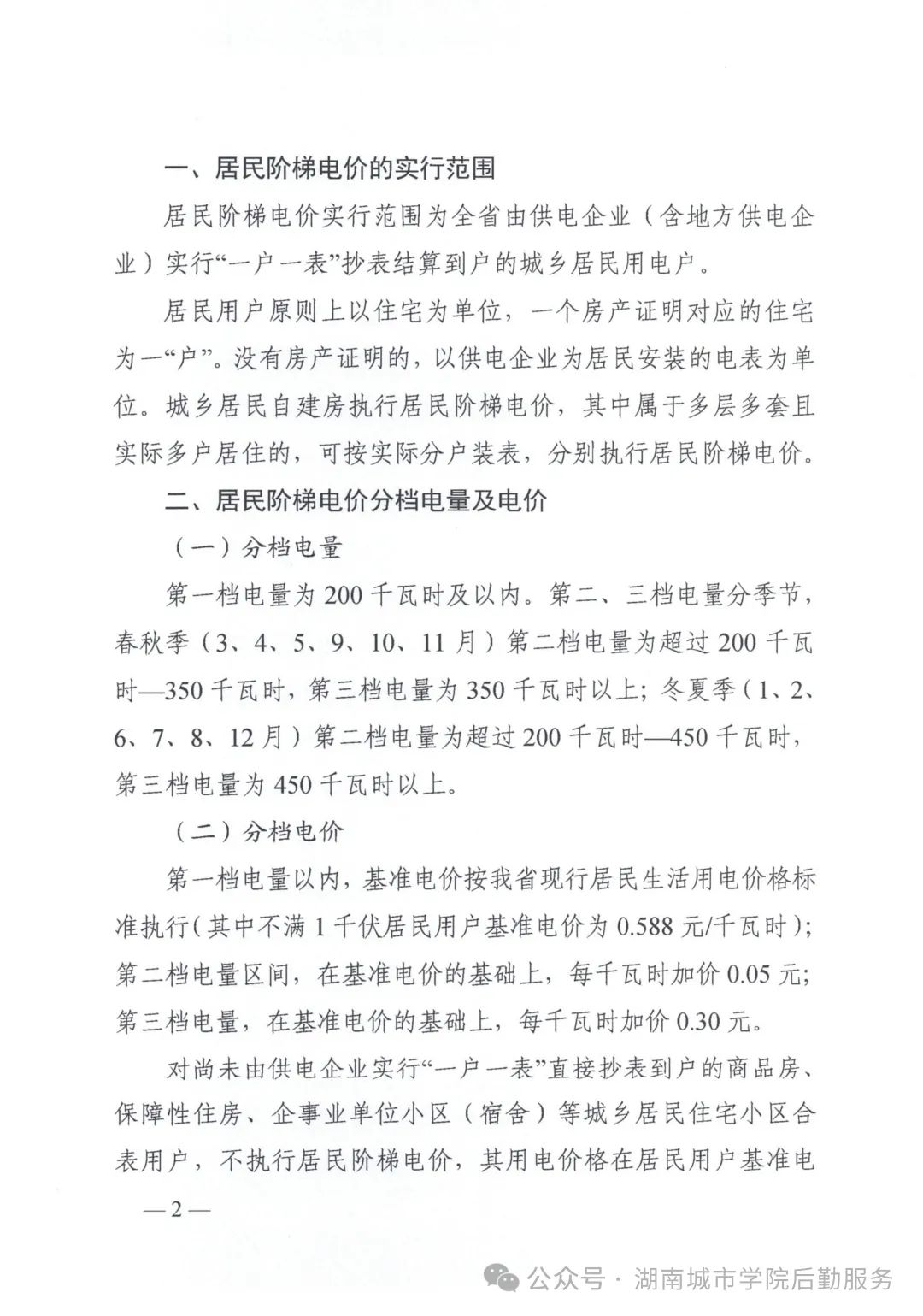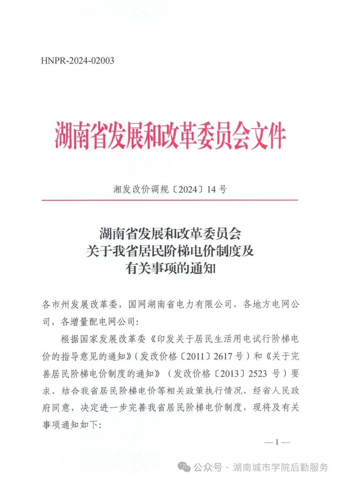 根据《湖南省发展和改委员会文件 湘发改价调规[2024]14号》文件,湖南省发展和改委员会关于我省居民阶梯电价制度及有关事项的通知,学校居民合表电价上调0.046元/度,学生宿舍、家属区、食堂、热水公司、洗衣机公司等执行居民合表电价的用电单位全部调整为0.635元/度。