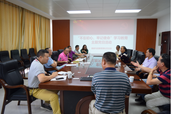 2019年9月19日下午,基建与后勤管理处党支部在二办公楼420会议室开展了“不忘初心,牢记使命”学习教育主题党日活动。活动由支部书记杨少清主持,全处党员、入党积极分子参加活动。