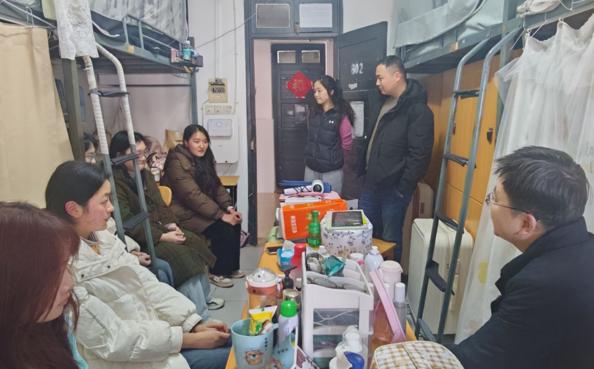 为充分发挥党支部的战斗堡垒作用与党员的先锋模范作用,切实加强学生思想政治教育工作,深入推进学风建设。根据学校组织部的统一安排,在党委教师工作部支部书记张伟的指导下,2025年2月27日支部成员赴对口联系寝室—机械与电器工程学院2024级12栋602寝室走访。