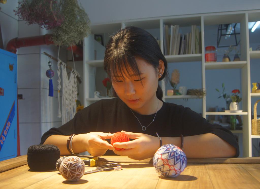 午饭后,客人们就来到了李飒的手工店,花费整个下午的时间跟着她学习编织手鞠球。